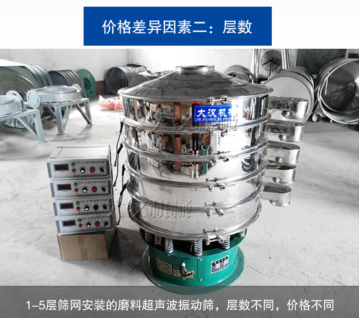 磨料超聲波振動篩在篩網安裝的層數上支持單層和多層,其中可達五層,能篩分出六種不同規格的物料,功能非常的強大,所以結構越復雜,價格就會對應增加。