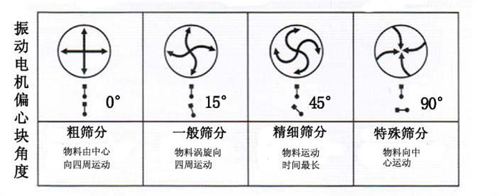 當(dāng)上下偏心塊調(diào)至0度時(shí),物料由中間向四周分散,用來(lái)大量篩分粗略的物料。